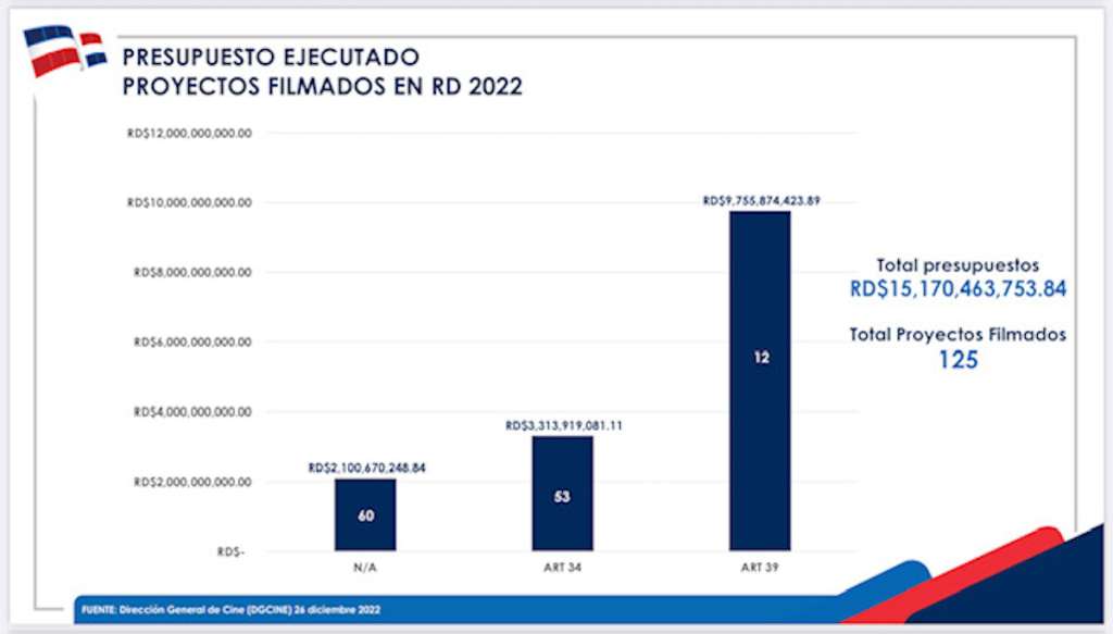 Para constatar el monto real de los beneficios del cine no solo se puede hablar de las películas dominicanas. Debe hablarse también, en el mismo nivel de importancia, de los ingresos que dejan al país las producciones de películas y series internacionales que se filman en el territorio nacional en base al artículo 39 de la Ley de Cine. De acuerdo a cifras oficiales de la Dgcine, en el año 2022, el presupuesto ejecutado en proyectos internacionales de cine realizado en el país fue de 9 mil 755 millones de pesos, de los cuales solo se exoneró el 25%, por lo que más de 7 mil millones se invirtieron, pagaron y gastaron en la economía.
